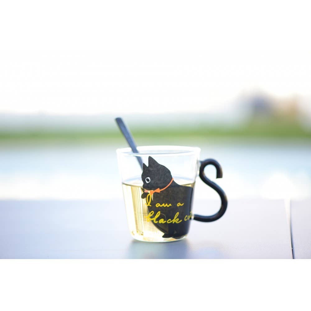 Drink your tea or hot chocolate with elegance with these glass mugs featuring a cat tail-shaped handle and cat motif. 'I am a cat' text is printed on the mugs in gold. These mugs, sold in a set of 2 without saucers, are made of double-walled glass, have a black cat tail-shaped handle, and a cat motif on the cup. This set is sold in a pretty box with a photo. From France. Measures 4.5"H x 3.5". Microwave and dishwasher safe.