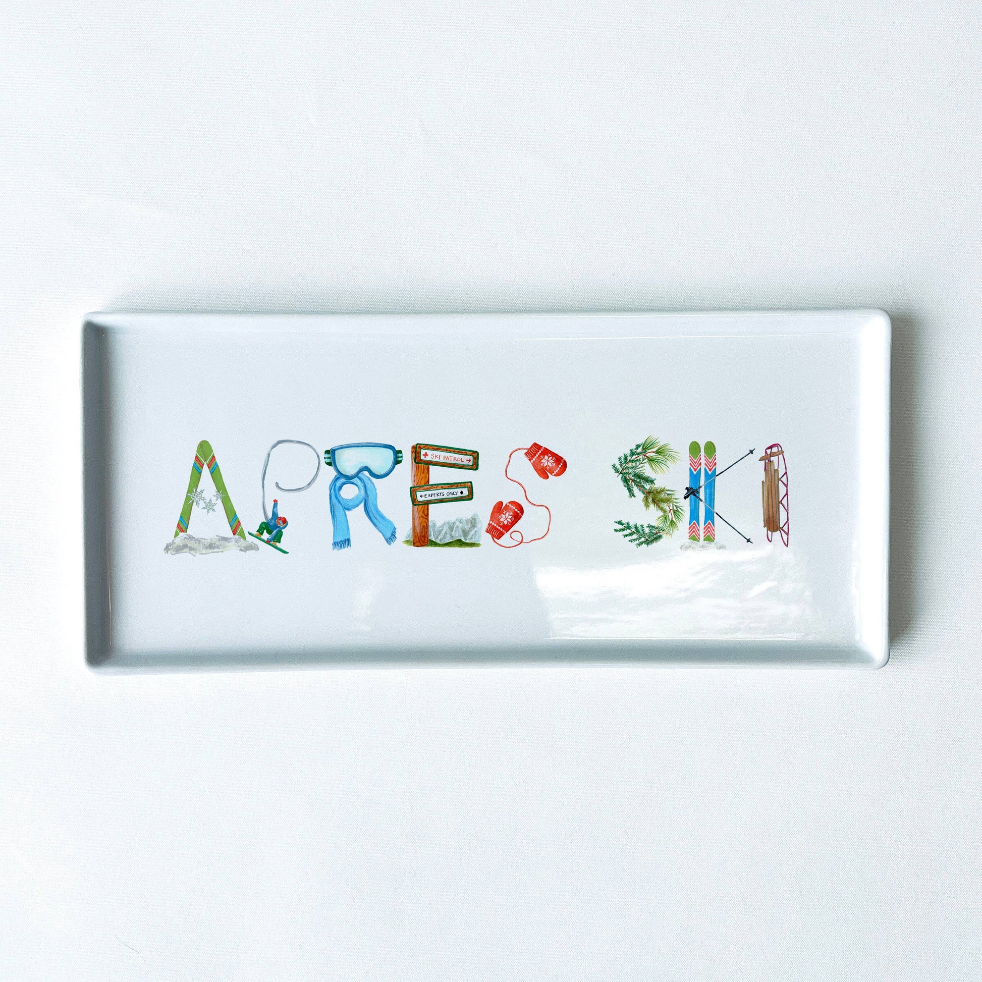 This tray is great for dining or even to be used as a dresser tray in the bedroom or bathroom. The words "Apres Ski" is spelled out using letters with a ski theme. Made of porcelain. Measures 10.5" x 4.75". Microwave and Dishwasher Safe.