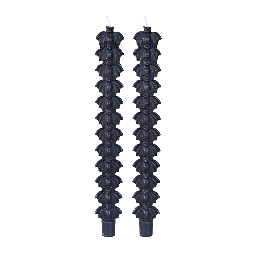 This taper candles are made to resemble bats stacked on top one another. Unscented. Set of 2. Measures 12"H.. Paraffin/Vegetable Wax with Cotton Wick.