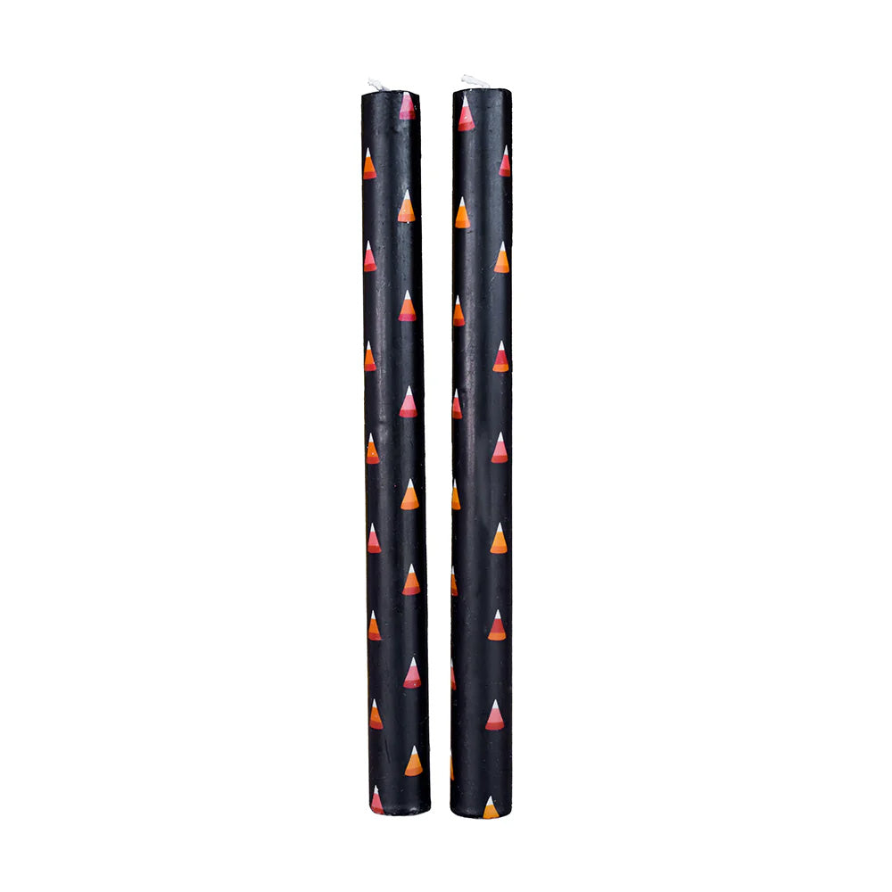 Black taper candles with candy corn design that have a matte finish. Measures 10"H. Set of 2. Made of Paraffin/Vegetable Wax with Cotton Wick. Unscented,