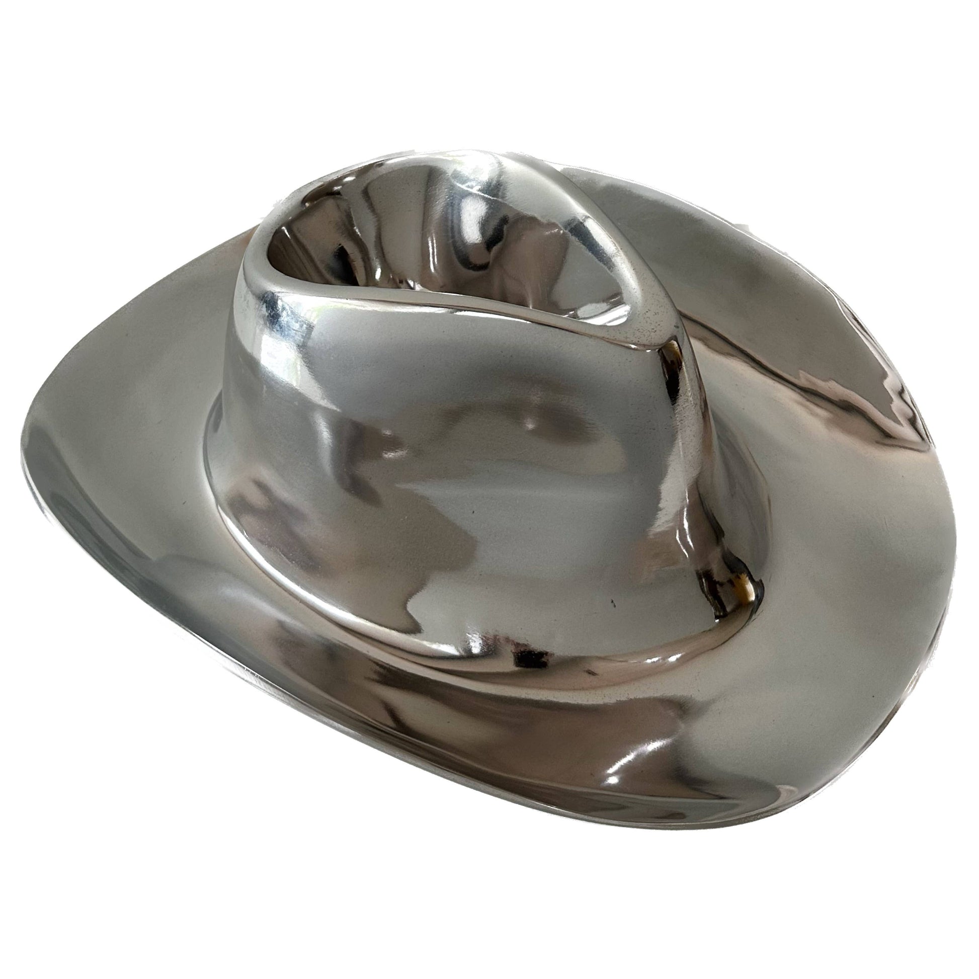 This chip and dip server is made to resemble a cowboy hat. This unique chip and dip set combines country and western style with functionality. Made from durable polished aluminum, it is designed to last for years to come. Whether you are hosting a party or simply enjoying a snack, this chip and dip set is sure to impress your guests. It also makes a great gift for him, adding a touch of rustic charm to any man's home. Measures 16"L.