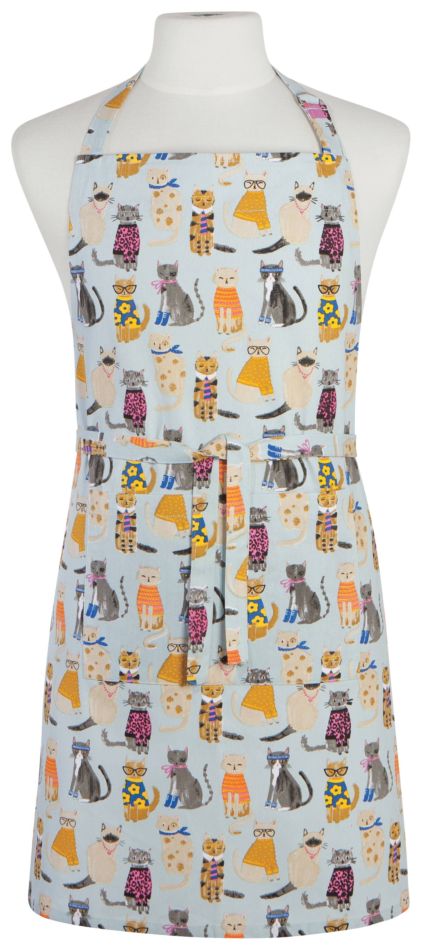 For the cat lover is this twill-weave cotton apron printed with various breed of cats. Features a handy pocket and adjustable neck strap with steel D-rings. Measures 32"L x 28"W. One size fits most. Made of 100% twill-weave cotton. Note: Machine wash warm, tumble dry low, high iron, do not bleach.