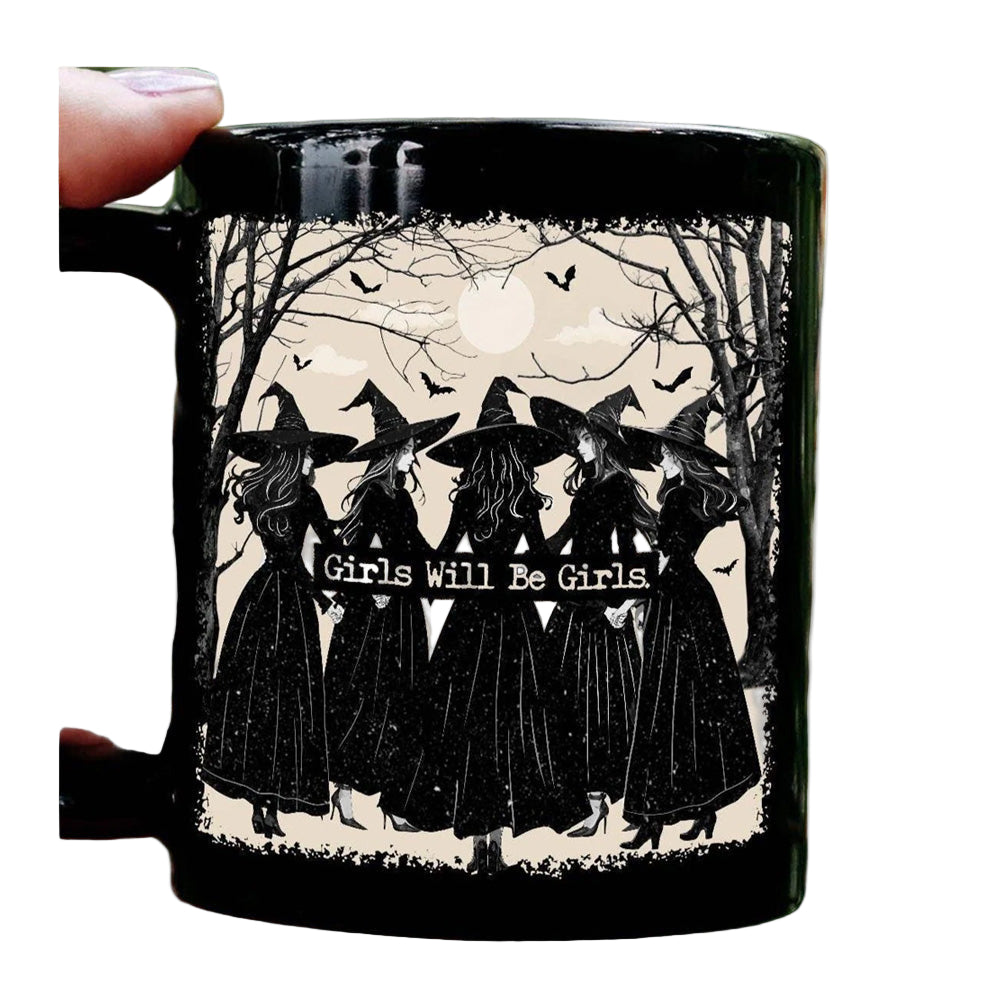 Black ceramic mug with images of witches and the words Girls Will Be Girls. Holds 15 oz. Clean in dishwasher or wash by hand with warm water and dish soap.