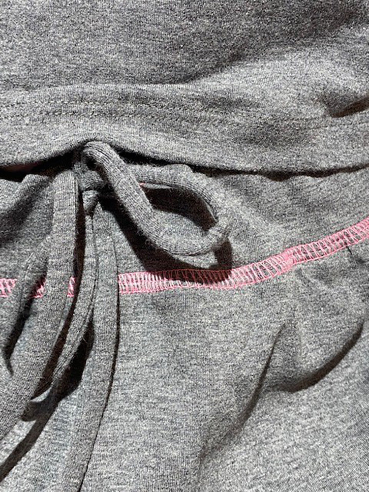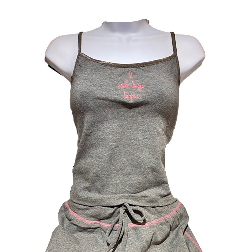 Perfect for the proactive gal, this affirmation drawstring and tank set can be worn to a yoga class or anytime you want to be comfy. The set comes in heather grey with the text "I make things happen" written in hot pink on the strappy tank top. The heather grey drawstring pants are made of 100% fine rib cotton with hot pink accent stitching on the seams.