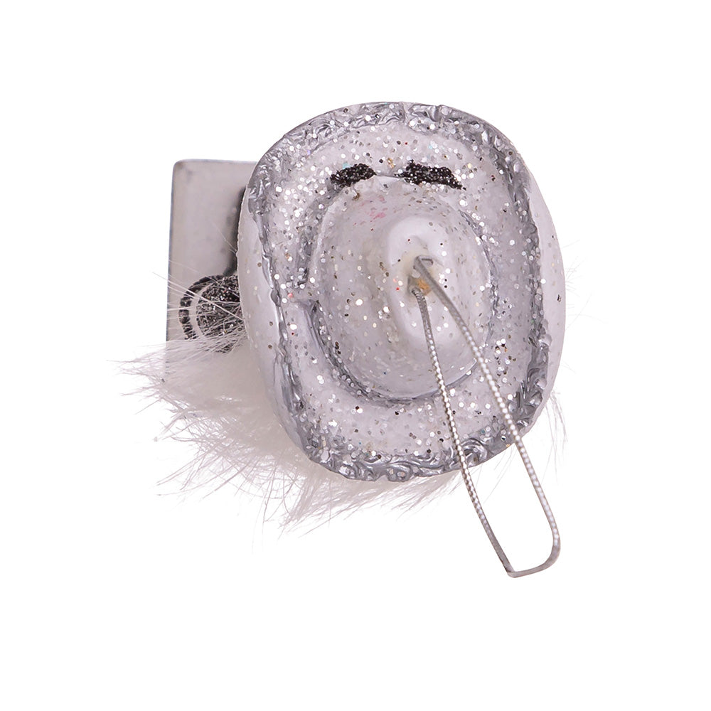This nutcracker ornament features cowboy wearing a black and white glittered outfit with a glittered cowboy hat and he is holding a white rope lasso in one hand. Made of wood solid, resin, paint/mica and wood composite. Measures 6"H.