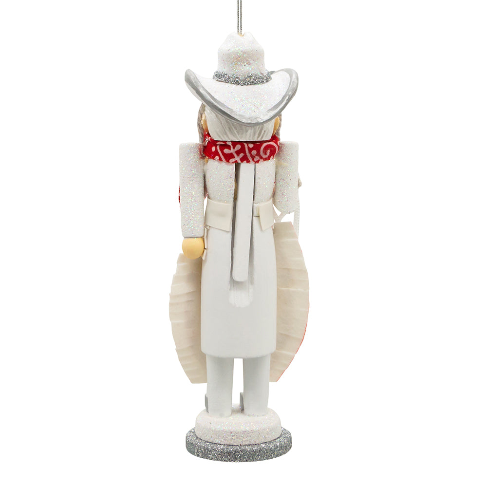 This 6-inch cowgirl nutcracker ornament features a cowgirl wearing a white glittered outfit with clear rhinestone accents and a matching cowboy hat. She is holding a lasso in one hand and is standing on a matching silver and white glittered base. Measures 6"H.