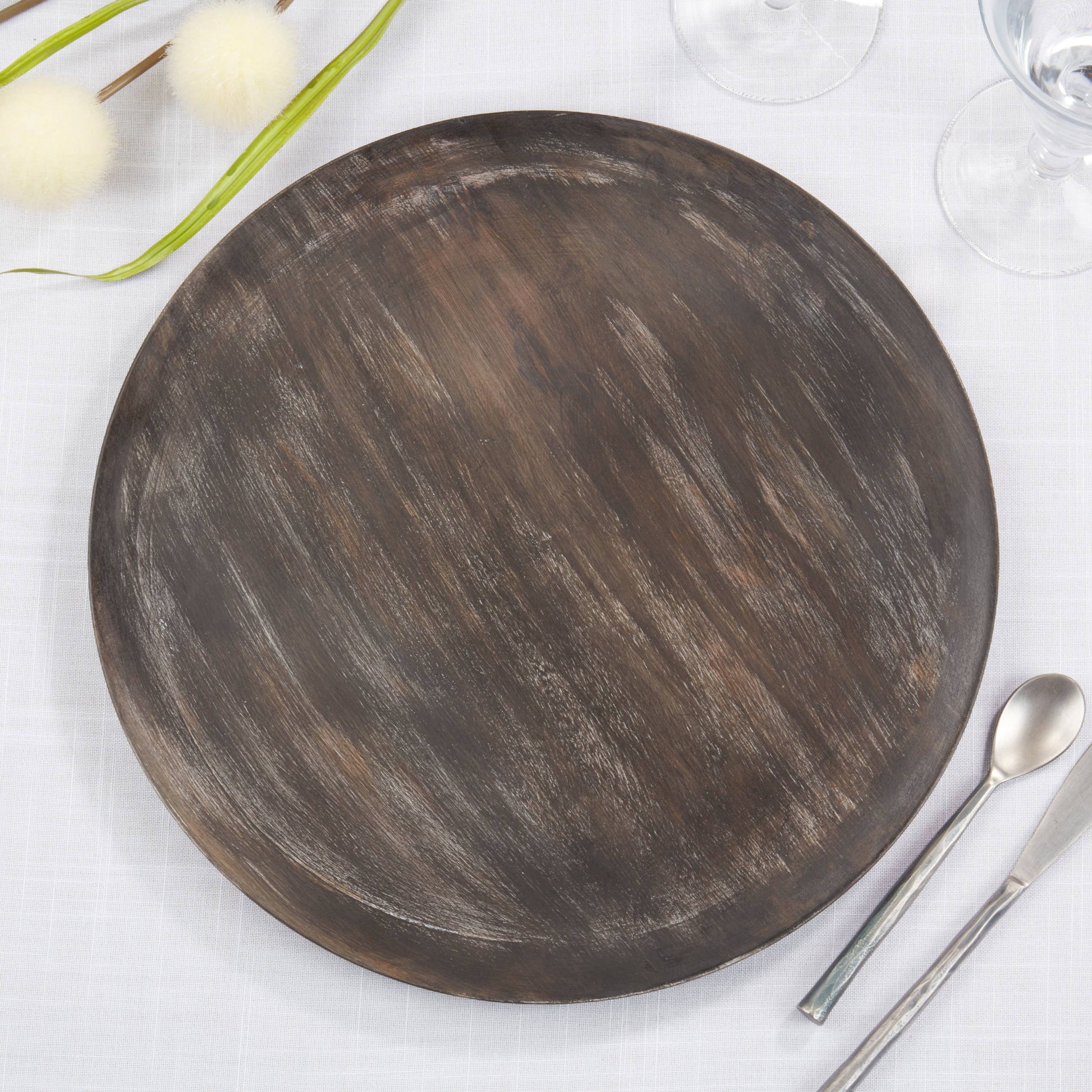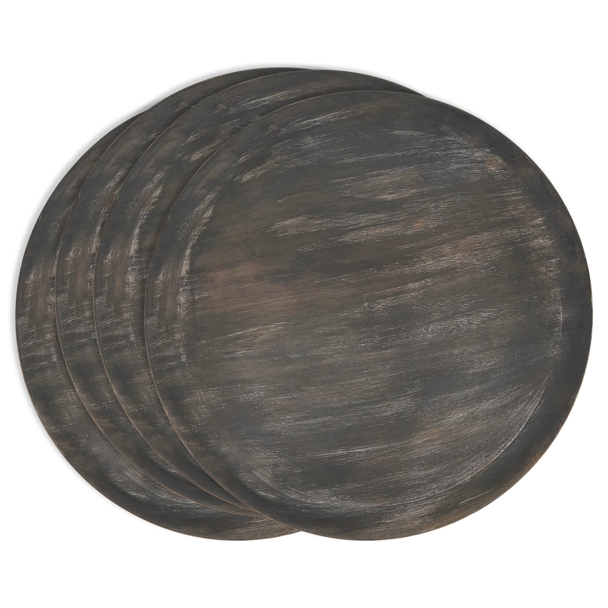 These plate chargers bring a warm and rustic charm to your table setting. Made from wood, they exude a natural, earthy appeal, creating the perfect backdrop for your culinary creations. Measures 14" in diameter. Set of 4.