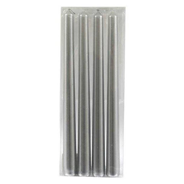 Shiny metallic silver taper candlesticks for completing a dinner tablescape. Set of 4. The candles are unscented. Measures 10"H.