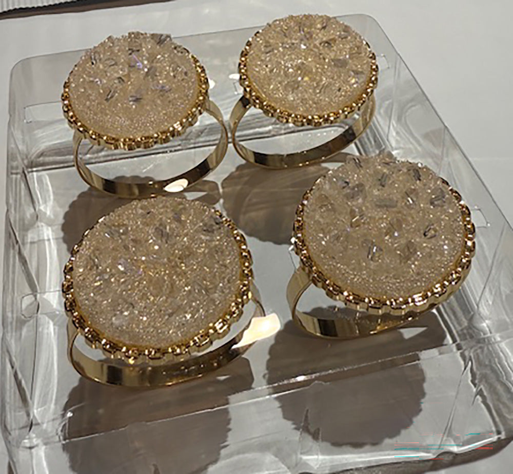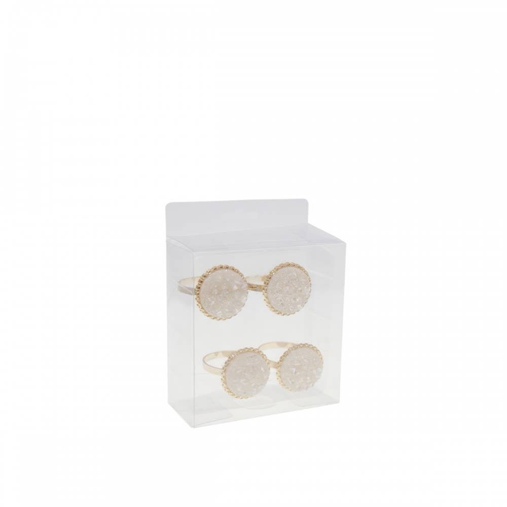 From France are these white napkin rings made to appear that they have flecks of diamonds. They are set in a gold circular frame. Measures 2" x 1.5" x 1". NOTE: Handwash only.