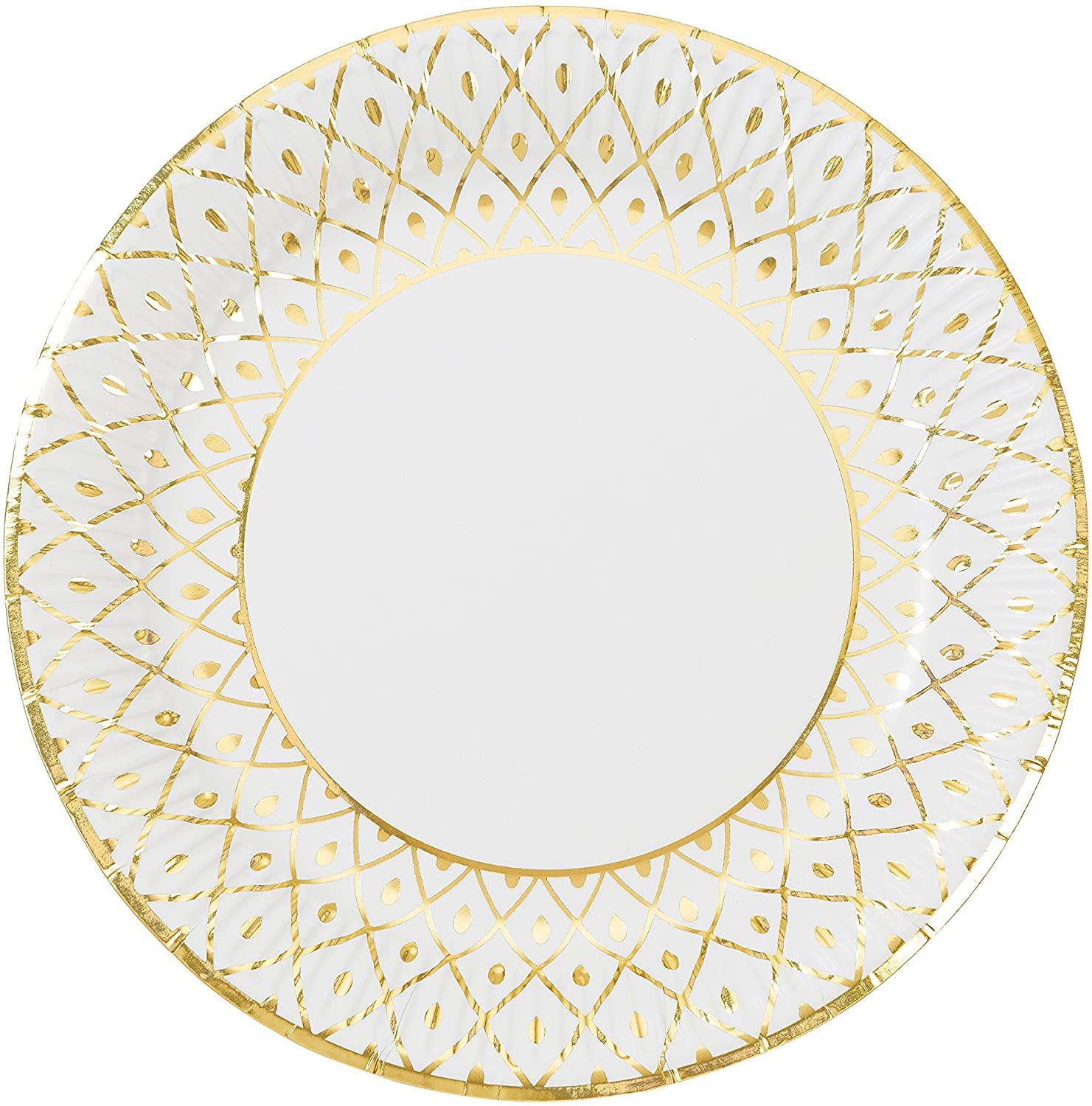 Paper plates with a gold pattern. A package of 8 paper plates. Measures 9" in diameter.