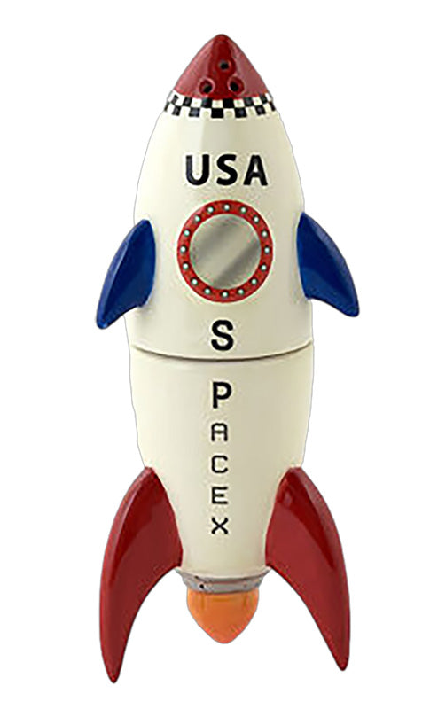 Salt and pepper shaker set made to resemble a rocket. Printed with the initials USA and the word Space X. Made of ceramic. Measures 5.5"H.