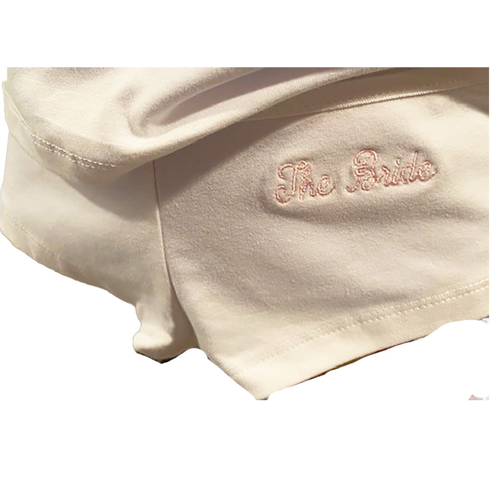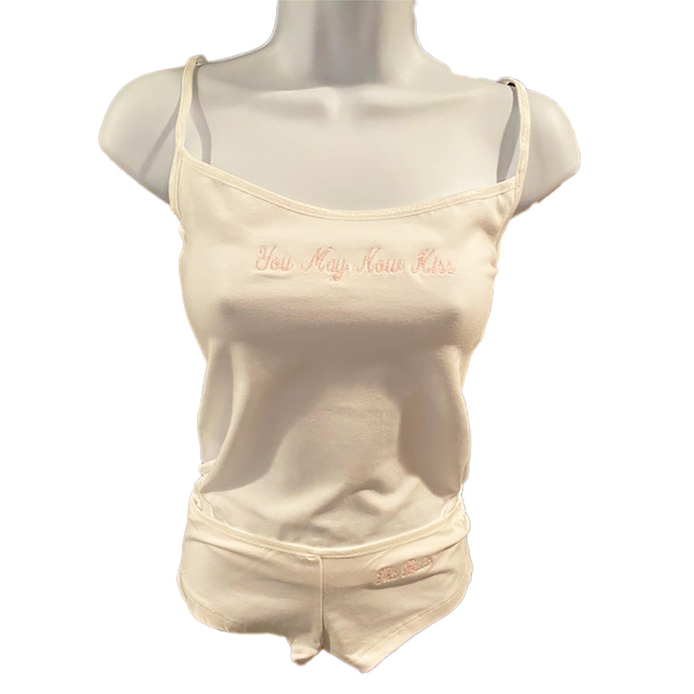 This camisole set has the words "You May Now Kiss.." embroidered in pink and hot shorts with the text "The Bride" .